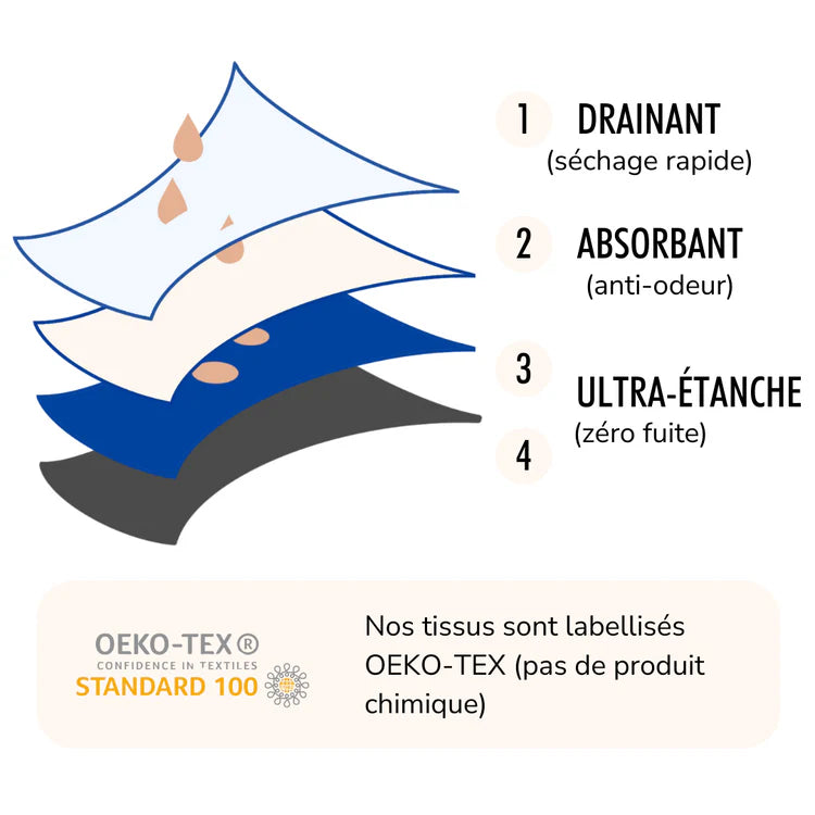 Cette conception assure que même en cas de fuites, vous restez au sec et à l'aise tout au long de la journée, sans souci d'inconfort ou d'humidité.